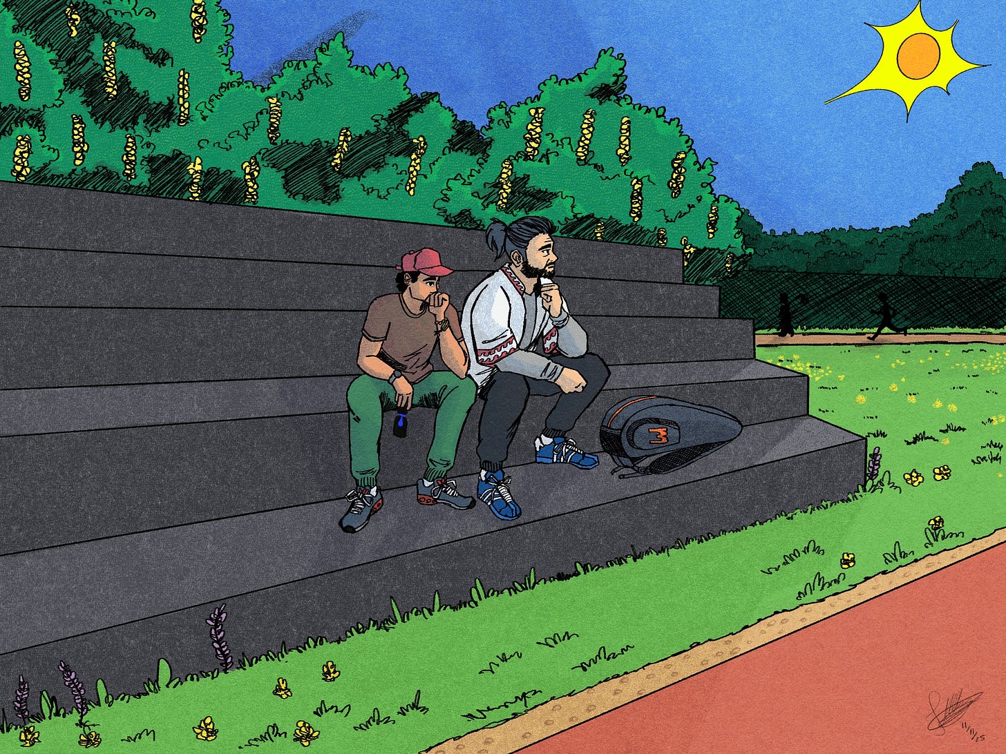 Os passos do treinador trovejaram ao subir a arquibancada até sentar-se ao lado do menino.